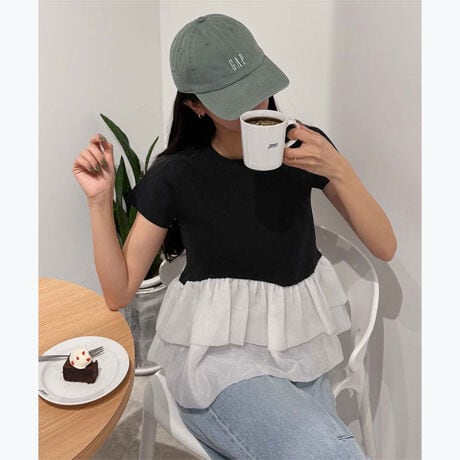 ・コンパクトな半袖ニットに、シアー素材のフリルをドッキングしたデザイントップス