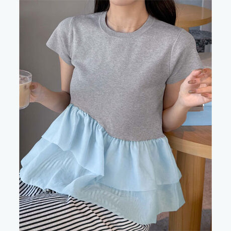 ・コンパクトな半袖ニットに、シアー素材のフリルをドッキングしたデザイントップス