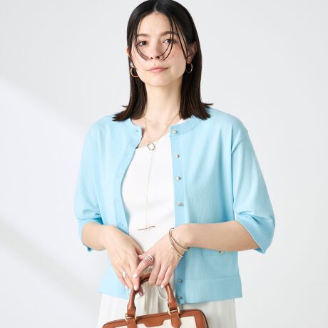 《手洗い可能》エアリーストレッチ5分袖Cネックカーディガン