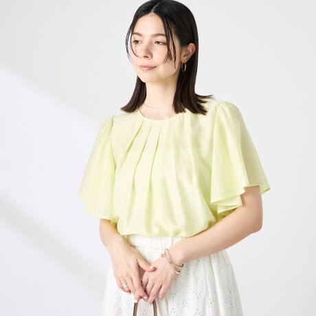 ・胸元のタックとボリュームのあるフレア袖が、一枚で着映えるブラウス