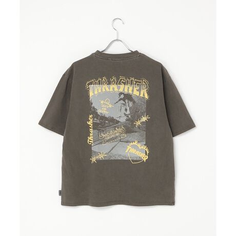 スケートボードのワンシーンを切り取ったフォトプリントに、「THRASHER/スラッシャー」らしい、遊び心のあるロゴモチーフを重ねたバックプリントが目を引くデザイン。
