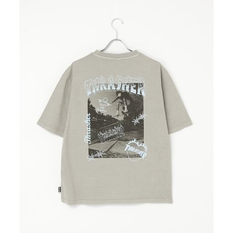 スケートボードのワンシーンを切り取ったフォトプリントに、「THRASHER/スラッシャー」らしい、遊び心のあるロゴモチーフを重ねたバックプリントが目を引くデザイン。