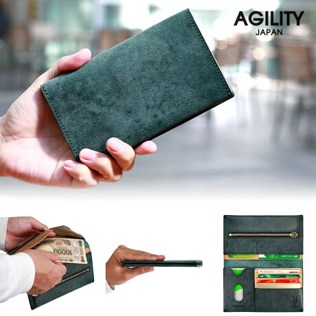 観音開きでスムーズ会計・小さな極薄長財布です。アシンメトリーなデザインで4か所に分かれたカード入れはカードをわかりやすく仕分けできます。本のように開けると左側が札入れ、右側がファスナー小銭れの設定です。左側の札入れは上下を縫わずに折り曲げる構造にすることで、お札ギリギリのコンパクトサイズにしています。札入れ中央を観音開きにすることで、コンパクトにもかかわらず札の出し入れがスムーズでストレスがないように考えました。手前の4段カード入れの下半分は縫わずに浮かせることで、お札を差し込みやすく、且つ引き出しやすくしています。左側の4段のカード入れに4枚のカード、上部のスライドホール付きのカード入れには2枚のカードが入ります。右側のマチ付きファスナーポケットには15〜20枚程度の小銭が入ります。浅く口が広いのに加えマチもついているので、小銭の出し入れがしやすくなっています。小銭入れ裏のスペースを利用して、下層にはカードが縦向きに2枚、上層には横向きに2枚入ります。財布を持ち歩く際、小銭が下層に集まる想定にしたとき、小銭と下層のカードが重ならない配置にすることで、中身を入れてもなるべく薄さをキープできるように工夫しました。右側の一番壁側のスペースにはレシートなどが収納できます。