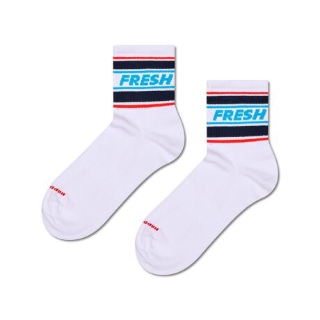 ファンキーなホワイトの1/2クルー・スポーツソックスで、外出先でも爽やかさをキープ。履き口近くに「fresh」の文字がデザインされており、ランナーやジム愛好家にぴったりです。