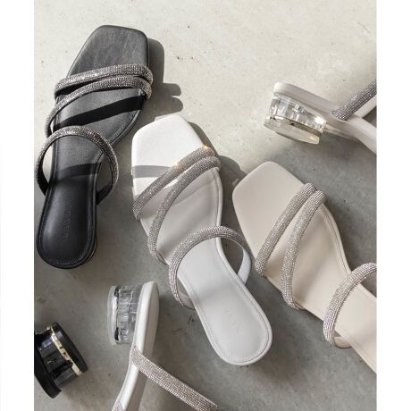 歩く度にキラキラと表情を変える繊細なビジューをあしらったストラップサンダル。