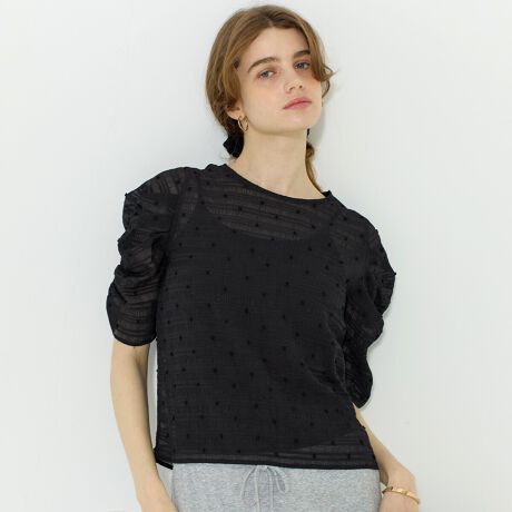 シアードットで華やぐ袖シャーリングトップス