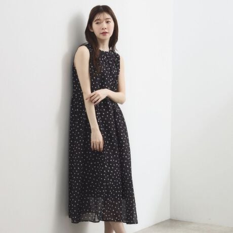 透け感のあるドット素材で仕立てた、スリーブレスワンピースです。