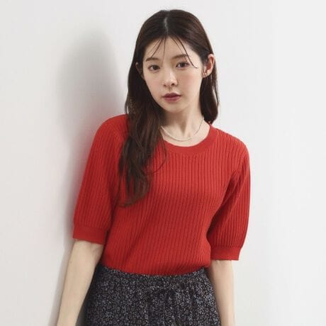 袖はやや丸みのある5分袖で女性らしい印象を与えつつ、気になる二の腕を自然にカバーします。
