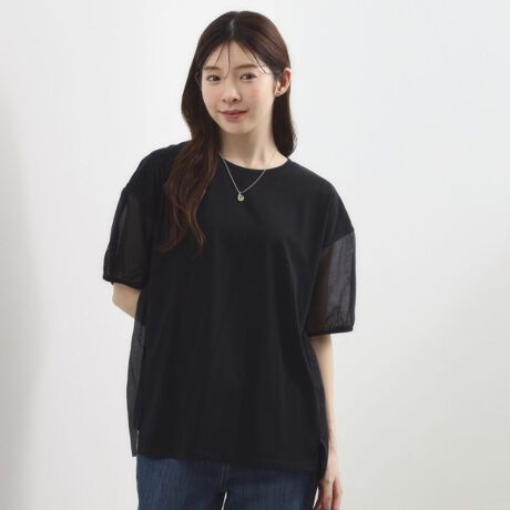 フロントはシンプルに仕上げながら、バックにシアー素材の細かなプリーツをドッキングしたデザインTシャツ。