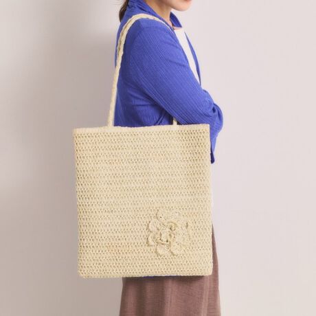 ざっくりと編み込まれたナチュラルな風合いの素材に、大ぶりのコサージュをあしらったトートバッグ。