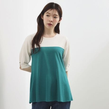 胸元から切り替えた配色デザインが、レイヤードしているような立体感を演出し一枚でサマになります。