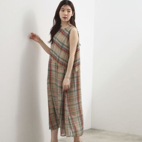 手書き風のチェック柄を使用した、スリーブレスワンピースです。