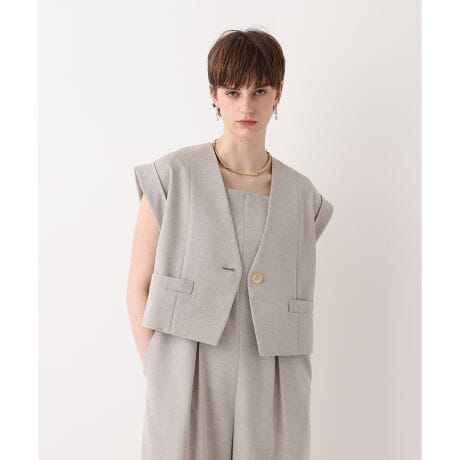 Tシャツやノースリーブなどが中心になる夏の季節に重ねて羽織っていただきたい、カラーレスでショート丈がポイントのジレ。