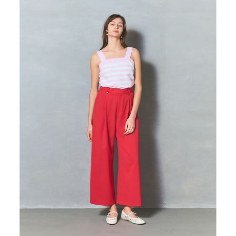 ほどよいシアー感とストレッチ性のある上品な夏素材を使用。 デザイン性のあるベルトループと、腰からまっすぐに落ちるハンサムなシルエットが特徴的な一本です。きちんと見えを叶えつつ、ウエストはバックゴム仕様でリラックスした楽な穿き心地を実現しました。ブラック、ホワイトのベーシックカラーに加え、おしゃれに決まる差し色レッドの3色展開です。