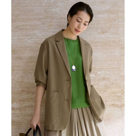 シャツ感覚でさらっと羽織れる今どきバランスのテーラードジャケット■デザイン抜け感のあるビッグシルエットが魅力のテーラードジャケットです。衿まわりはジャケットらしく端正に仕立てつつ、肩はドロップさせ、太めの袖や身頃はシャツのように軽やかな仕立てにすることで、気軽に羽織れるライトジャケットに仕上げました。程よいシアー感のある素材が、今年らしい印象を演出します。袖をシャツのようにロールアップした着こなしもおすすめです。■素材超長綿であるスーピマ綿を使用し、シャリ感のあるポリエステル糸と交織したボイル素材です。通常のボイル素材よりやや甘く織り上げた後、ワッシャー加工を施すことで、ナチュラルな表面感とさらっとした風合いに仕上げました。程よい透け感と、ボイル組織ならではの軽やかさがあり、シャリ感を残すことで肌離れも良く、盛夏に向けて快適に着用いただけます。接触冷感機能付きです。■同素材ワンピース(OPW7LM0502)