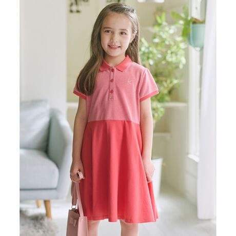 ■デザインコントラストの効いた2色で染め分けられたカノコポロシャツと無地のフレアスカートを合わせたようなドッキングワンピースです。