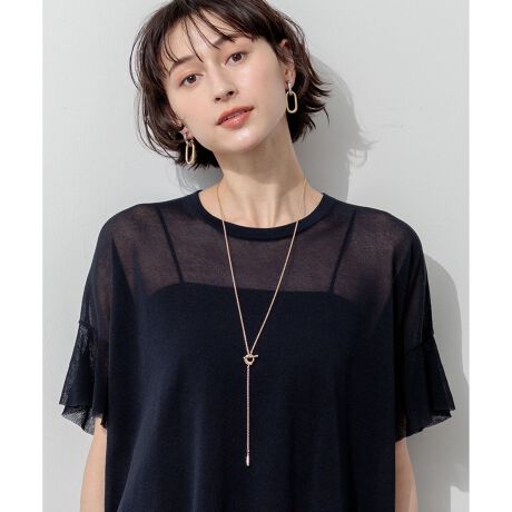 オーバル型のトップにバーをくぐらせた、ラリエットネックレスです。縦のラインを強調するすっきりとしたシルエットが、首元を美しく引き立てます。先端には雫型のメタルをあしらい、動くたびにさりげない輝きをプラス。シンプルながらも印象的で、スタイリングに上品なアクセントを添えるアイテムです。Vネックやボートネックのトップスと合わせると、よりすっきりとした印象に。シンプルなニットやブラウスに合わせるだけで、一気にこなれ感がアップします。普段使いからオフィススタイル、ちょっとしたお出かけまで幅広いシーンで活躍し、コーディネートを格上げしてくれる頼れるアイテムです。カラーは、華やかで女性らしい印象を与えるゴールド(#090)と、洗練されたクールな雰囲気を醸し出すシルバー(#091)の2色展開です。