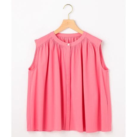 ■デザイン・襟ぐりから細かにギャザーを入れたふんわりシルエットのカットソー。・ノースリーブデザインながら、肩から背中にかけての立体的なギャザーで、身体のラインをすっきりとさりげなくカバーしてくれます。・フロントはボタンが隠れる比翼仕立てで、ブラウスのように仕上げています。・スカートにもパンツにも合わせやすい絶妙な丈感で、オフィススタイルから休日のお出かけまで幅広いシーンで着回せます。