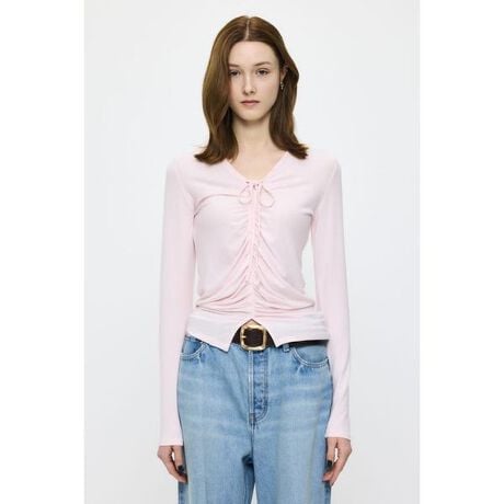 【GATHER V/N CUT TOP/ギャザーブイネック カットトップス】■ポイントフロントに施されたギャザーデザインが印象的なカットトップス。縦ラインを強調し、女性らしいシルエットを引き立てながらスタイルアップを叶えます。■ディテール柔らかく肌なじみの良い素材を使用し、着心地も抜群。フロントのリボンディテールと細やかなギャザーが立体感を生み、シンプルながら存在感のある一着に仕上げています。■スタイリングデニムと合わせたカジュアルスタイルはもちろん、ミニボトムやスラックスと合わせて女性らしさを引き立てた着こなしもおすすめです。