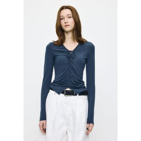 【GATHER V/N CUT TOP/ギャザーブイネック カットトップス】■ポイントフロントに施されたギャザーデザインが印象的なカットトップス。縦ラインを強調し、女性らしいシルエットを引き立てながらスタイルアップを叶えます。■ディテール柔らかく肌なじみの良い素材を使用し、着心地も抜群。フロントのリボンディテールと細やかなギャザーが立体感を生み、シンプルながら存在感のある一着に仕上げています。■スタイリングデニムと合わせたカジュアルスタイルはもちろん、ミニボトムやスラックスと合わせて女性らしさを引き立てた着こなしもおすすめです。