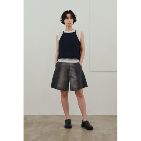 BLK:モデル身長167cm(Mサイズ着用)BLU:モデル身長163cm(Mサイズ着用)パネルごとにカラー差をつけた立体感のあるリメイク風デザインが魅力のハーフデニム。異なるトーンを組み合わせることで奥行きが生まれ、履くだけでこなれた印象に導きます。シンプルなTシャツと合わせるだけでコーディネートが完成する主役級アイテムで、コンパクトなトップスやショート丈アイテムと合わせるとよりバランスよく着こなせます。ストレッチなし、透け感なし。【お手入れ方法】マシンウォッシュ可※デニムの特性上、着用や洗濯により退色し独特な色変化が生じます。・雨や汗等の湿った状態、着用や洗濯、クリーニングによって他の衣類、雑貨、家具等に色落ちします。・白・淡色との組み合わせは避けて下さい。