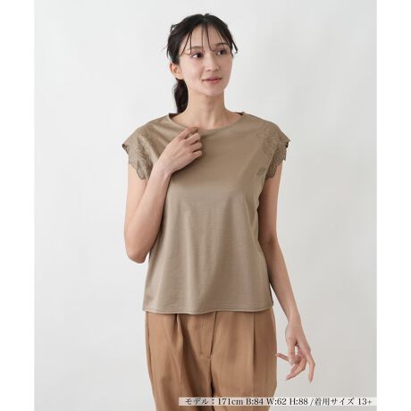 袖に施された華やかな刺繍が、シンプルなカットソースタイルをエレガントに格上げしてくれる一枚。丁寧に仕上げられた刺繍は、気になる二の腕のラインを素敵にカバーしてくれる嬉しい効果も。身頃には、しっとりとしたなめらかな質感と美しい目面を持つ、良質なジャージー素材を厳選しました。肌触りが良く、着心地も快適です。一枚で着るだけで顔周りがぱっと華やぎ、アクセサリー要らずの存在感を放ちます。夏のシンプルな着こなしに、上品な彩りを添えてくれるアイテム。お出かけが楽しくなるような、特別なカットソーです。