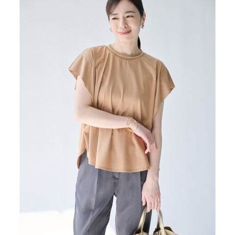 流れるようなドレープを描く優雅な袖デザインが目を惹くカットソー。この美しいシルエットを際立たせるのは、上品な光沢とドレープ感のある、上質なコットンレーヨンジャージー素材です。衿ぐりはニットの編み立てで仕上げ、さりげなく小粋なアクセントをプラス。気になる腕のラインをお洒落にカバーしながら、エレガントな雰囲気を演出します。身頃はシンプルなので、どんなボトムスとも相性抜群。一枚で着るだけで、コーディネートがドラマティックに華やぐ、デザイン性の高い一着です。