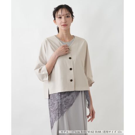 まるでカーディガンのように軽やかに羽織れる、コンパクトな丈感のノーカラージャケット。布帛のようなきちんとした見栄えでありながら、実は伸縮性に富んだストレッチ素材を使用しているため、動きやすく快適な着心地です。肩の凝らないジャケットは、お仕事から普段使いまで幅広いシーンで活躍します。シンプルなデザインは合わせるインナーを選ばず、ワンピースに羽織ればエレガントな装いに。ご自宅で手軽にお手入れができるイージーケア性も、忙しい現代女性にとって嬉しいポイント。一着あると重宝する、頼れるアイテムです。