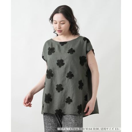 さらりとした肌触りが心地よい、天然素材の生地を使用したブラウスです。仕立てた後に染め上げる「製品染め」を施すことで、素材特有のシボ感や柔らかなニュアンスを引き出しました。一番のこだわりは、生地と一緒に染まらずに浮き上がるフラワー刺繍。ベースのニュアンスカラーと、力強い刺繍のコントラストが、大人の遊び心を演出します。顔周りをすっきりと見せるボートネックと、肩を優しく覆うフレンチスリーブが、女性らしい華奢な印象を強調。着込むほどに肌に馴染む、育てる楽しみも味わえる、イタリアブランド「ROSSO35」の特別な一着です。