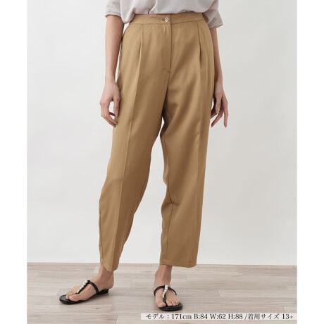 なめらかな肌触りとしなやかな風合いが、素足に心地よく馴染むツイル素材のパンツ。センタープレスが縦のラインを強調し、脚をまっすぐきれいに見せてくれます。カジュアルな素材感ながらも、このセンタープレスがあることで、上品な印象で着こなしていただけるのがポイント。ウエストにあしらわれたメタル調のボタンが、さりげない高級感をプラスします。きれいめなブラウスはもちろん、Tシャツやスニーカーと合わせた上品カジュアルなスタイルも素敵。日々のコーディネートを格上げしてくれる、質の良さが光る一本です。