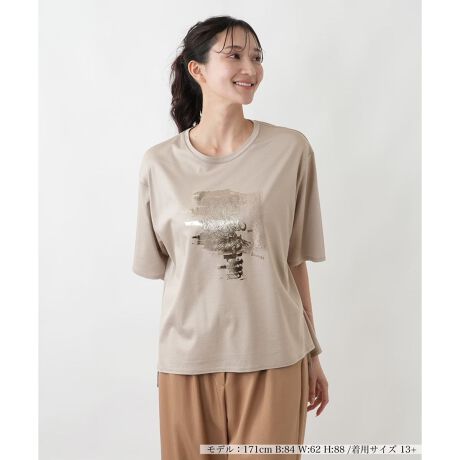 大人の女性にこそ着ていただきたい、エレガントなデザインのTシャツ。繊細なレース生地の上から、刷毛で描いたようなタッチで箔プリントを施し、アーティスティックな表情に仕上げました。しっとりと柔らかな風合いで着心地が良く、美しい目面が特徴の良質なジャージー素材を使用しているため、カジュアルな中にも品格が漂います。シンプルなボトムスに合わせるだけで、ぐっと華やかで洗練された印象に。ジャケットのインナーとして、きらめきをのぞかせるのも素敵です。夏の装いの主役になること間違いなしの一枚です。