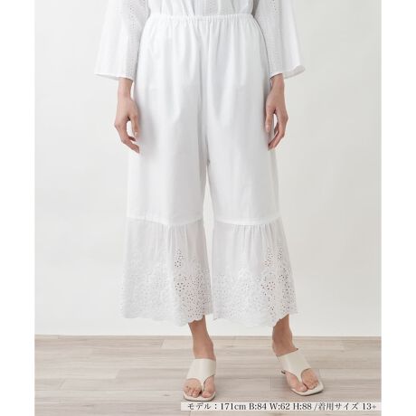 裾に贅沢にあしらわれたスカラップレースが、足元に可憐な華やぎを添えるガウチョパンツ。ワンピースやチュニック、ロングスカートの下に重ねて、レースをのぞかせるレイヤードスタイルにおすすめの一着です。透けにくい裏地付きで、素足に心地よいコットン素材を使用しているため、ペチコート感覚で快適にお召しいただけます。ウエストは総ゴム仕様で、リラックスしたはき心地。いつものワンピーススタイルも、このパンツを一枚重ねるだけで、ぐっと新鮮で奥行きのあるお洒落な着こなしに生まれ変わります。