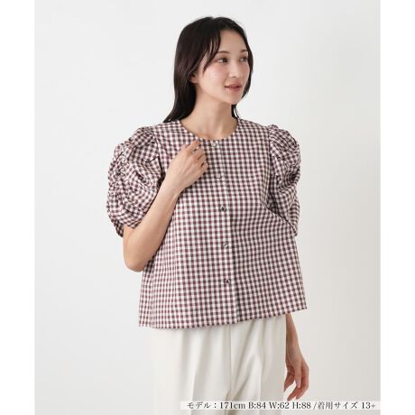 ギンガムチェック柄が印象的な「NEMIKA」のブラウス。大人の女性に似合う洗練されたチェック柄が、コーディネートをぐっとスタイリッシュに引き締めます。顔周りをすっきりと見せるノーカラーの丸首デザインと、動きのあるパフ袖のデザインが、シンプルながらも個性を感じさせる一枚。一枚で着映えするため、シンプルなボトムスと合わせるだけで、感度の高い着こなしが完成します。ご自宅で手軽にお手入れができるのも嬉しいポイント。いつものスタイルに新鮮な風を吹き込む、デザイン性の高いアイテムは、お洒落心を刺激してくれます。