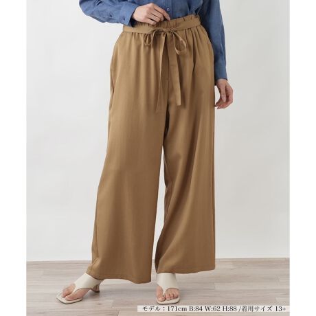 なめらかな肌触りと、しなやかな風合いが素足にも心地よいツイル素材のワイドパンツ。歩くたびに優雅なドレープが生まれ、女性らしいエレガントな雰囲気を演出します。ウエストは総ゴム仕様で、締め付け感のないリラックスしたはき心地。それでいて、フロントにはファスナーのように見えるステッチを施すことで、ラフになりすぎない、きちんと感をプラスしました。美しいシルエットと快適な着用感を両立した、大人の女性にふさわしい一本。ブラウスやジャケットを合わせれば、きれいめなシーンにも対応可能です。