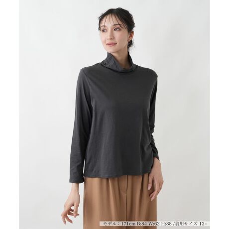 ソフトで優しい肌触りと、リラックスできる着心地の良さが特長のコットンブレンド素材を使用したハイネックカットソー。気になる首元を上品にカバーしながら、日差しからも肌を守ります。程よく身体にフィットするシルエットは、一枚で着るのはもちろん、インナーとしても大活躍。シャツやワンピース、ジャケットとの重ね着スタイルに欠かせない一枚です。ベーシックなデザインとカラーは、どんなアイテムとも相性が良く、着回し力も抜群。何枚あっても困らない、ワードローブの必需品としておすすめします。