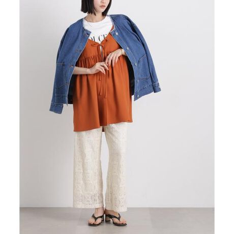 スタイリングに華やかさをプラスしてくれる幾何学柄レースがポイントのロングパンツ。ウエストゴムのリラックス感ある履き心地も魅力。同素材展開のシャツとのセットアップスタイルもおすすめです。