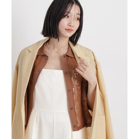 繊細で落ち着いた雰囲気の幾何学柄レースを使用した半袖シャツ。ボックスシルエットの短すぎない着丈がどんなボトムスとも合わせやすく、羽織りとしても一枚着としても重宝。同素材展開のパンツとのセットアップスタイルもおすすめです。
