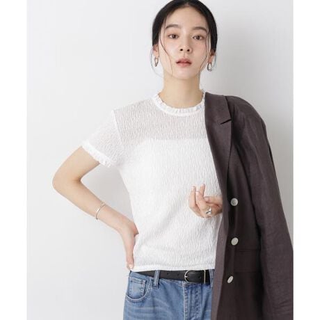 表情のあるシワ感素材が特徴の半袖トップス。素材のニュアンスとさりげないディテールワークが、一枚で着映えするトップスです。
