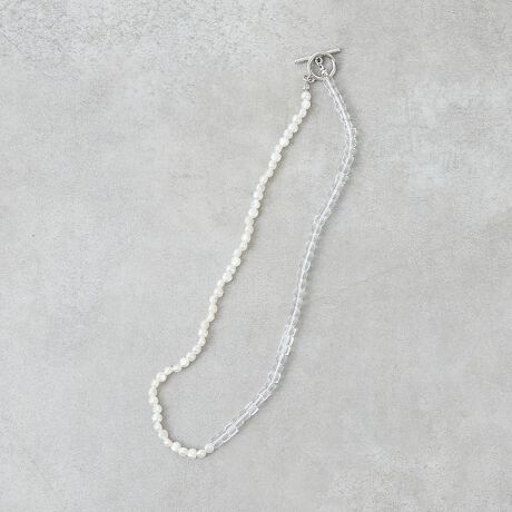 樹脂パールとクリアパーツを組み合わせた、異素材のコントラストが楽しめるネックレス。