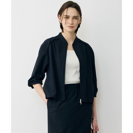 ■デザインアーム周りにゆとりを持たせた、ジップアップタイプのトラックブルゾンです。衿は低めの設定ながらも日よけ対策になり、後ろのフライヨーク下にはメッシュ裏地をつけることで通気性に考慮したデザインに仕上げました。さらに前肩までヨークを伸ばし、前側の肩にもエアーベントを配しています。同シリーズのスカートとのセットアップスタイルはもちろん、キレイめパンツとの相性も良く、春から夏にかけて大活躍すること間違いなしの一枚です。