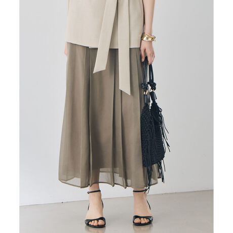 ウエストゴムでラクなのにきれい見えな大人のシアープリーツ■デザイン裾まで丁寧にタックを施したプリーツスカートです。ナチュラル感のある表情豊かなシアー素材を使用し、重なり合う生地が奥行きのある表情を演出します。腰まわりは膨らみを抑え、広がり過ぎないシルエットに仕上げることで、大人っぽく落ち着いた印象になっています。すっきりとした見え感ながら、ウエストにはゴム入りのコンフォートな着心地が魅力です。■素材ナチュラルタッチの繊細なポリエステルボイルに特殊加工を施し、ラミー調に仕上げたオーガンジー素材です。程よいハリコシ感と、ラミー調の程よく凹凸のある糸が織りなす陰影感が特徴です。麻見えでありながらポリエステル100%なので、イージーケアなのもポイントです。