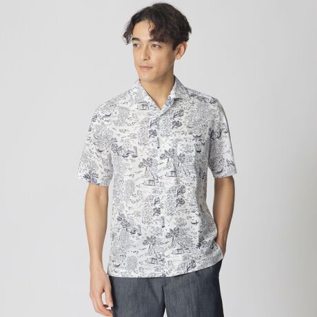 半袖のイタリアンカラーシャツの着丈を調整し、スクエアカットにすることで、上品なリゾートシャツデザインにしました。