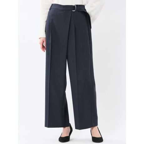 ベルト風のD管がアクセントになったストレートパンツです。アシンメトリーなラップデザインがポイント。ウエストはバックシャーリングで着用ストレスを軽減。センタープレス、前ファスナー仕様、ホック&ボタン付き、前後ポケット付きです。
