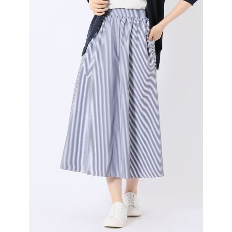 シンプルなトップスと合わせてスカートを主役にしたコーディネートがおすすめ。ストライプ柄の縦ラインが、スタイルをすっきりと美しくみせてくれます。