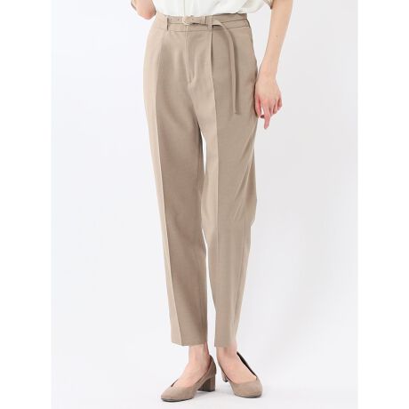 バックル付きの共生地ベルトが付属した、ワンタックのテーパードパンツです。ウエストはサイドシャーリングで着用ストレスを軽減。センタープレス加工、前ファスナー仕様、ホック&ボタン付き、前後ポケット付きです。
