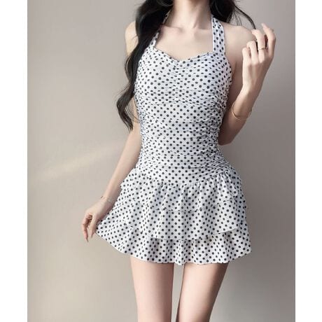 モノトーンのドット柄×ホルターネック×ティアードフリルのガーリーな要素をたっぷり詰め込んだ、レトロな雰囲気漂うワンピース水着。