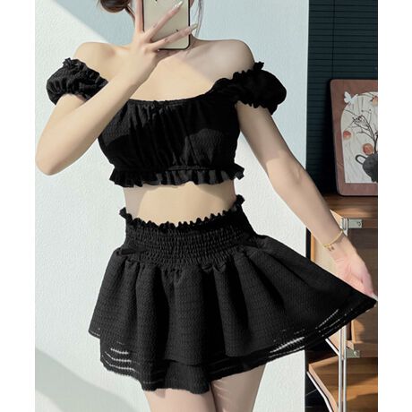 オフショルダーブラトップ、ショートパンツに加え、同素材のフリルミニスカートがセットになった水着3点セット。