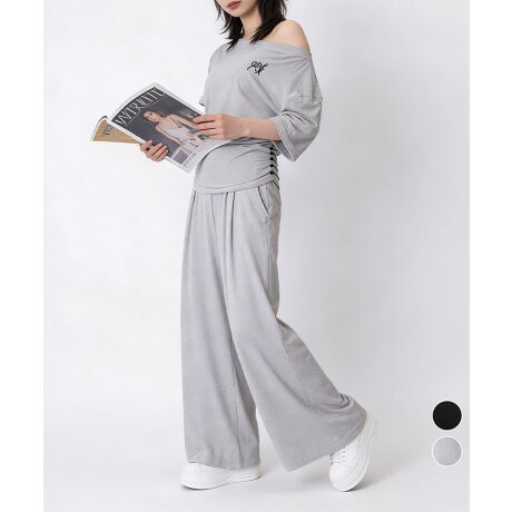 ワンショルダーデザインが魅力のトップスとワイドパンツのセットアップ。