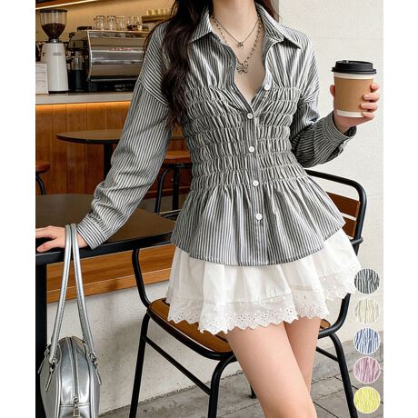 爽やかなストライプ柄の生地で仕立てた、清楚な雰囲気のペプラムブラウス。