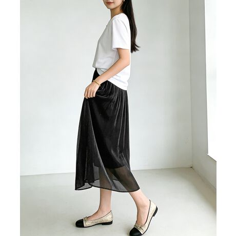 光沢感があり、なめらかな質感が特徴のフレアスカート